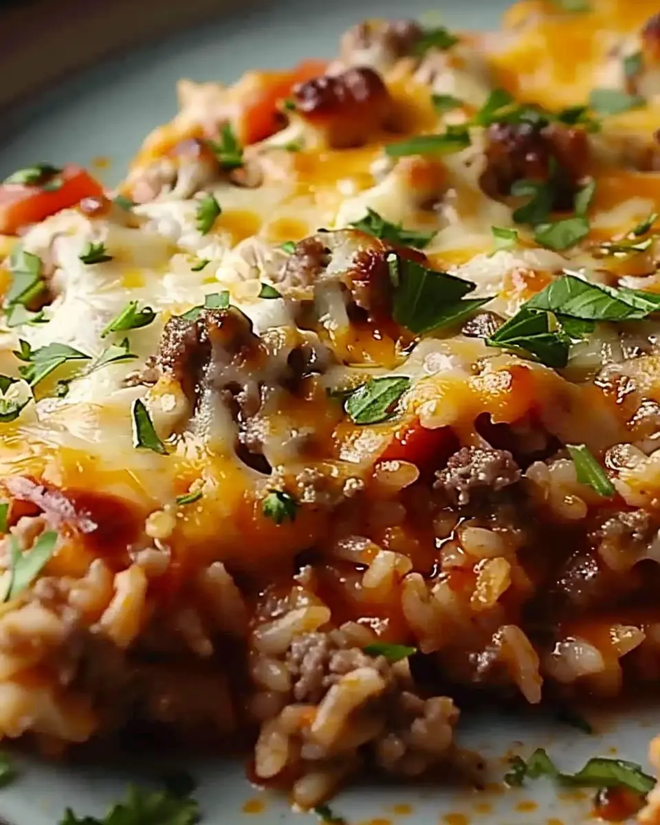 PrintCheesy Hamburger Rice Casserole: A Comforting Family Favorite