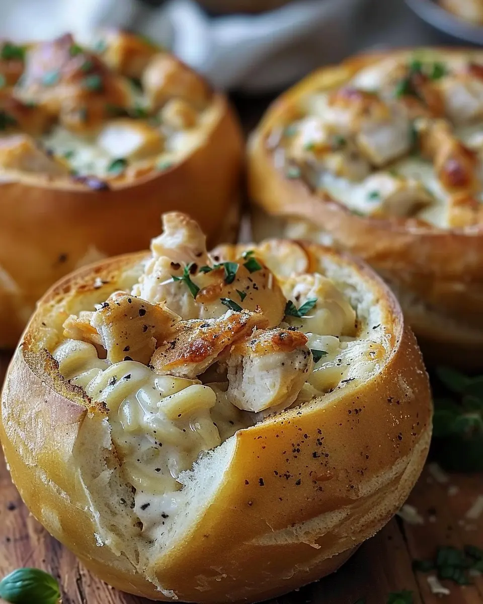 Keywords: Chicken Alfredo Garlic Bread Bowls, comfort food, easy recipes