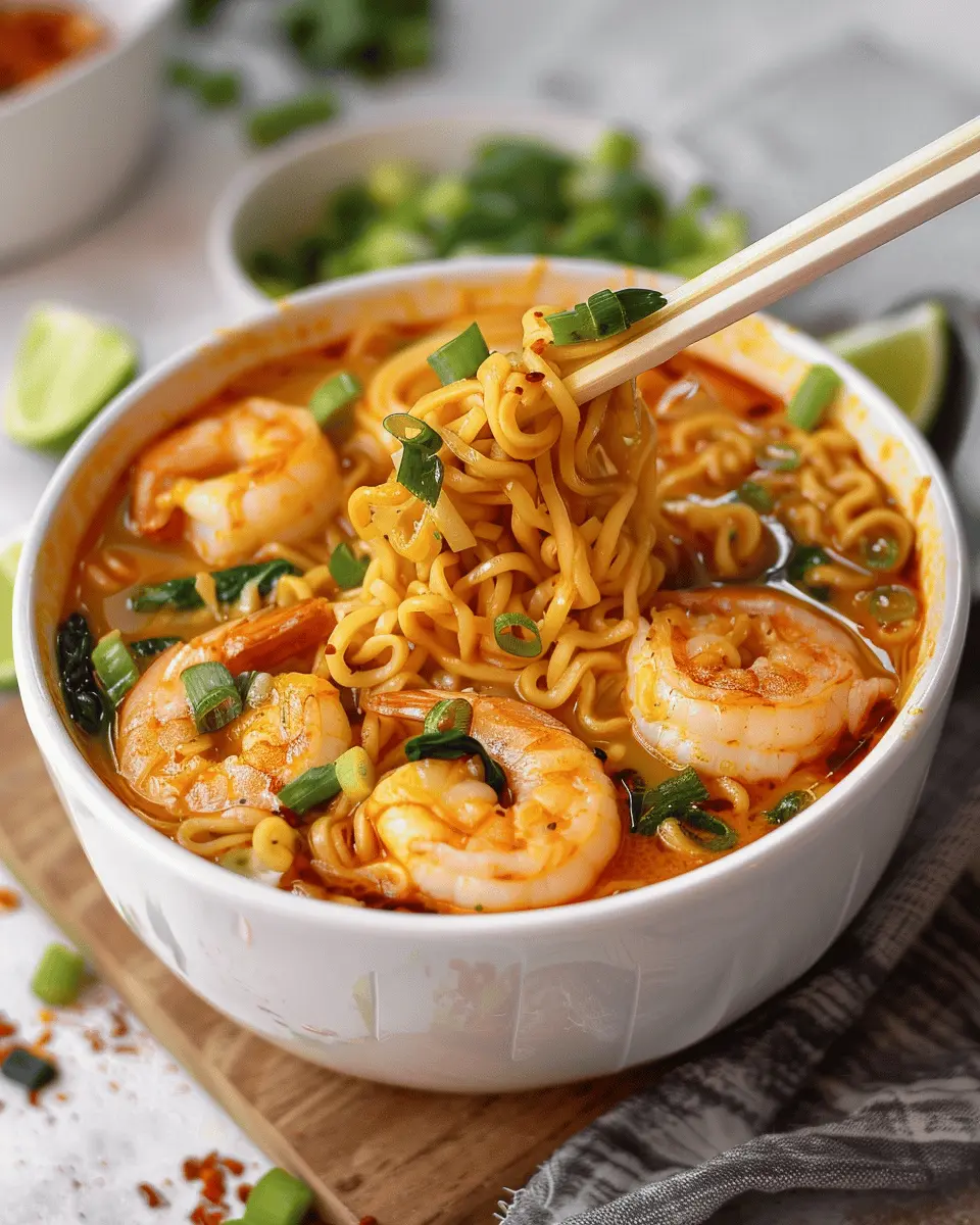 Absolutely! Instant ramen noodles are a fantastic shortcut for this spicy shrimp ramen recipe. They cook quickly and absorb the broth’s flavors efficiently. Just be mindful to follow the cooking instructions on the package—they usually require less time than traditional noodles. Plus, you can elevate the instant noodles by adding your favorite toppings, like scallions or a soft-boiled egg, to enhance the dish.