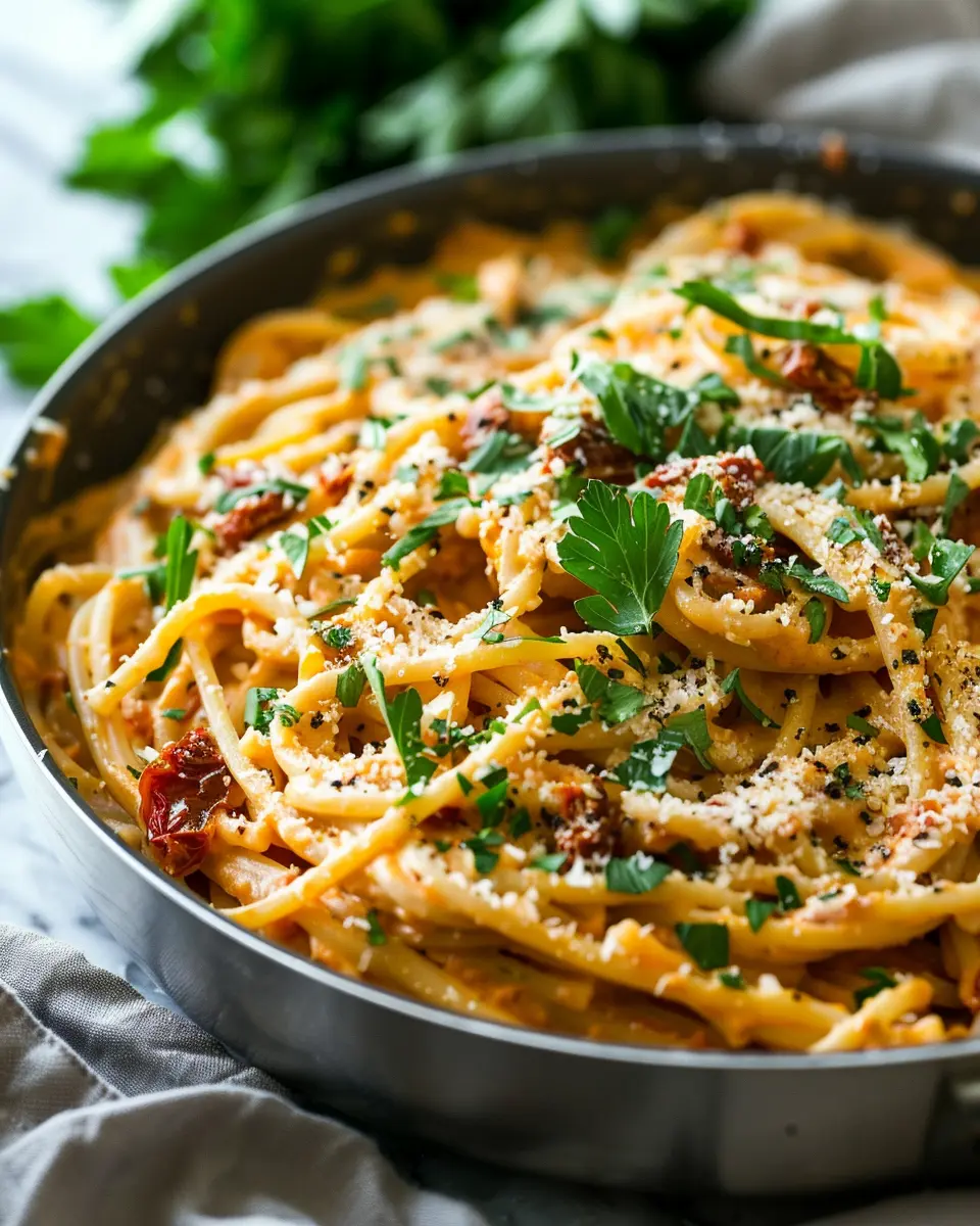 A delightful vegan pasta recipe that brings comfort and flavor with creamy sun dried tomatoes.
